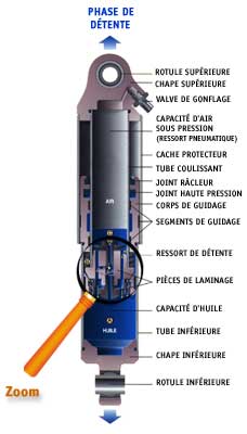 - Un amortisseur (généralement hydraulique) qui assure la stabilisation et le contrôle des mouvements du véhicule lors des phases compression et détente.